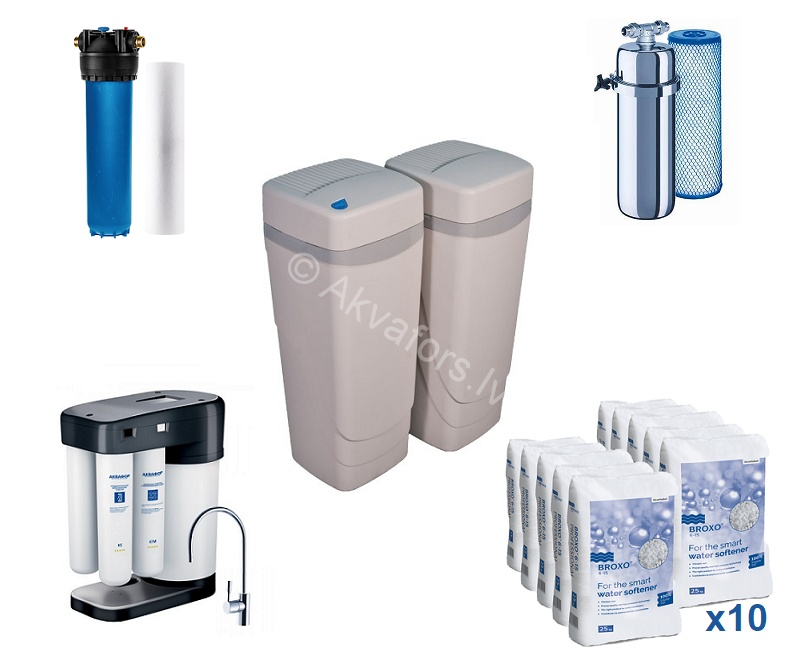 The kit includes: Aquphor BigBlue20 mechanical pre-filter, Aquaphor WaterMax AQK 220 softener and iron remover, postfilter Auqaphor Viking Maxi with carbon cartridge, Aquaphor DWM-102S Black edition drinking filter and BROXO salt(25kg) 10 pcs.
