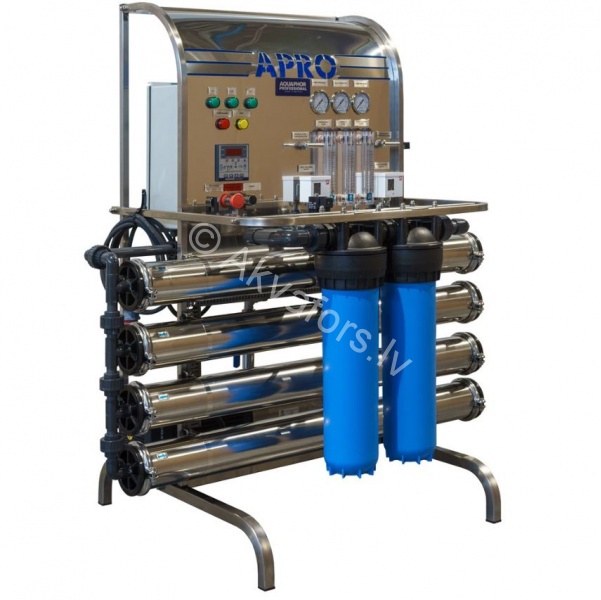 UF-RO line of water purfication systems is designed for medium to large enterprises with a variety of clean water applications and strict quality control requirements. UF prefilter protecs RO membrane and prologs uninterrupted supply of permeate before the maintenance is needed. Drainage water is recirculated through the prefiltration cartridges providing effective backwash. The system is assembled on a singe frame, uses TDS meters and pressure controls to monitor performance and service status. System self-service is controlled by the programmable logic controller (PLC).