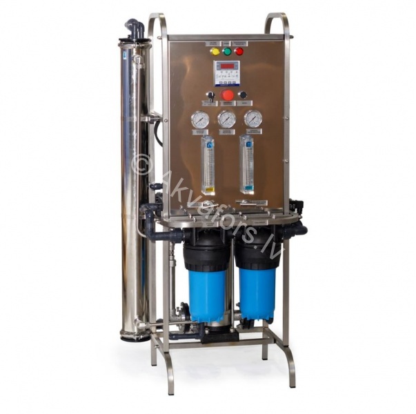 UF-RO line of water purfication systems is designed for medium to large enterprises with a variety of clean water applications and strict quality control requirements. UF prefilter protecs RO membrane and prologs uninterrupted supply of permeate before the maintenance is needed. Drainage water is recirculated through the prefiltration cartridges providing effective backwash. The system is assembled on a singe frame, uses TDS meters and pressure controls to monitor performance and service status. System self-service is controlled by the programmable logic controller (PLC).