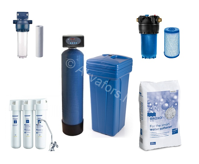The kit includes Aquaboss mechanical filter, Aquaphor SF-1035 softener and iron remover, Auqaphor BigBlue10 with B510-12 carbon cartridge, Aquaphor Crystal A drinking filter and BROXO salt (25kg).