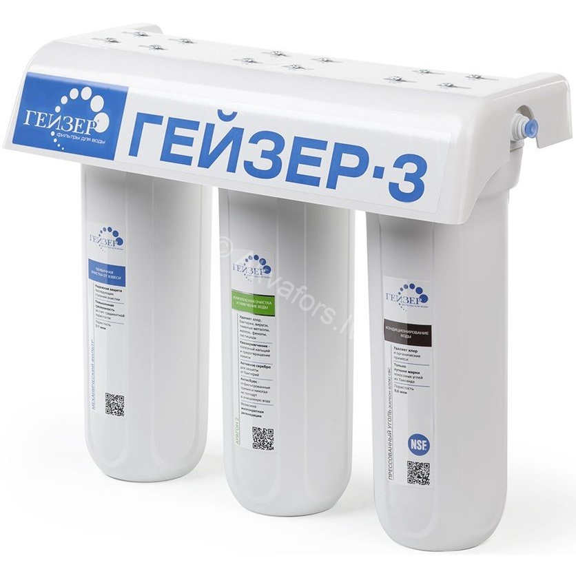 Trijų pakopų srauto filtras Geyser 3 IVZH Lux gali pašalinti iš skysčio visus junginius, kurie neigiamai veikia organizmą, tinka kietam vandeniui su standartine filtravimo schema ir padidintu sunkiųjų metalų, geležies, chloro pašalinimo ištekliu. kaip organinės priemaišos. Jis pristatomas kartu su kranu Nr. 3.
