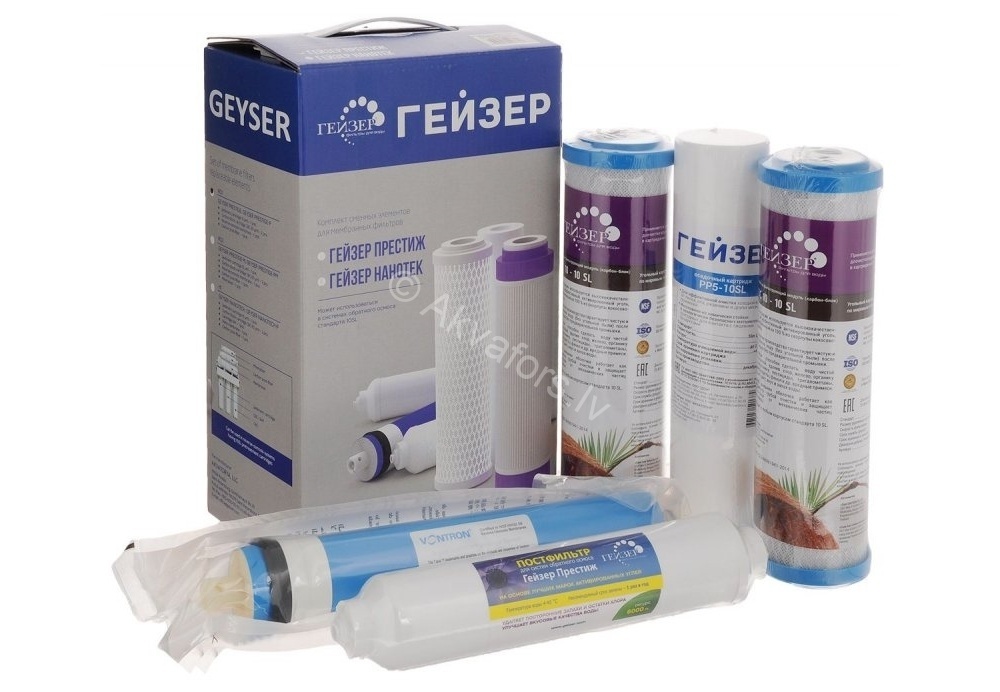 Комплект картриджей Гейзер "RO1" предназначен для замены исчерпавших свой ресурс картриджей с системой обратного осмоса Гейзер Престиж.
