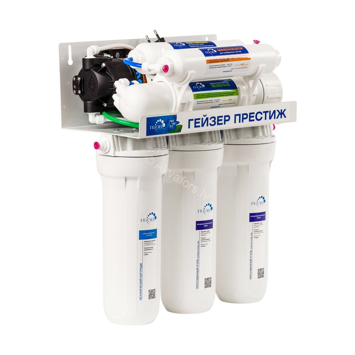 Технология обратного осмоса, использованная в фильтре Гейзер Престиж, заключается в фильтровании воды через полупроницаемую мембрану. Размеры пор мембраны настолько малы, что пропускают только молекулы воды. Размер молекул большинства примесей, а также бактерий и вирусов значительно больше молекул воды, поэтому они не проходят через мембрану. Фильтр Гейзер Престиж П работает при давлении в подводящей магистрали не менее 2 атм. Устройство повышения давления, входящее в комплект, повысит уровень давления до 3-6 атм.