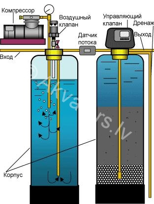 Принцип работы фильтров опирается на аэрацию и фильтрацию. Когда неочищенная вода аэрируется, железо, марганец и механические примеси образуют малые наросты, которые можно фильтровать. Взвешенные вещества фильтруются через фильтрующий материал, который всыпан в фильтр. Фильтры регулярно через определенный интервал промываются в зависимости от загрязнения и потребления воды. После промывания фильтры снова готовы к очистке воды. Оборудование состоит из реактора и фильтрa.