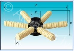 Дистрибьюторы различаются по форме, размерам, диаметру и прочим характеристикам, которые подбираются под конкретные требования системы водоочистки. Однако в общем случае, распределительное устройство представляет собой компактную деталь, сделанную из прочного, стойкого к ударам пластика. В стенках корпуса распределителя есть посадочные резьбовые отверстия, а также отверстие, с помощью которого устройство подсоединяется к водоподъемной трубке. В корпусе или лучах (отходящих во все стороны боковых пластиковых трубках) есть калиброванные прорези и присоединительная резьба.