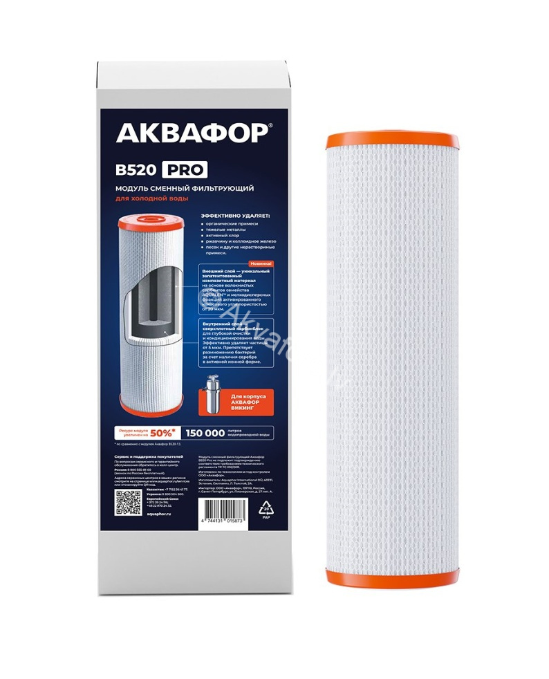 Сменный модуль водоочистителя Викинг для комплексной предочистки холодной воды. В520 PRO состоит из двух слоев: из воды одновременно удаляется ржавчина, коллоидное железо, песок, другие видимые загрязнения, а также — химические примеси — органические соединения, тяжелые металлы, хлор и другие токсины и аллергены.